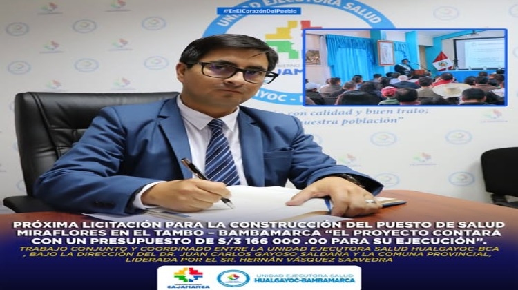 “𝙀𝙡 𝙥𝙧𝙤𝙮𝙚𝙘𝙩𝙤 𝙘𝙤𝙣𝙩𝙖𝙧𝙖́ 𝙘𝙤𝙣 𝙪𝙣 𝙥𝙧𝙚𝙨𝙪𝙥𝙪𝙚𝙨𝙩𝙤 𝙙𝙚 3 𝙢𝙞𝙡𝙡𝙤𝙣𝙚𝙨 166 𝙢𝙞𝙡 𝙨𝙤𝙡𝙚𝙨 𝙥𝙖𝙧𝙖 𝙨𝙪 𝙚𝙟𝙚𝙘𝙪𝙘𝙞𝙤́𝙣”. Gracias al trabajo conjunto y coordinado entre la Unidad Ejecutora de Salud Hualgayoc – Bambamarca, bajo la dirección del Dr. Juan Carlos Gayoso Saldaña y la comuna provincial, liderada por el Sr. Hernán Vásquez Saavedra, en los próximos días se realizará la licitación para la futura construcción del Puesto de Salud Miraflores, perteneciente al centro poblado El Tambo, Bambamarca. Este importante anuncio fue realizado este jueves 15 de mayo del presente, por el burgomaestre provincial de Hualgayoc, durante la primera audiencia pública de rendición de cuentas 2025. La obra será ejecutada con una inversión de S/ 3,166,000.00 (tres millones ciento sesenta y seis mil soles), gracias a las buenas relaciones y el trabajo coordinado entre la Unidad Ejecutora de Salud, la Municipalidad Provincial y el Gobierno Regional de Cajamarca. El Dr. Juan Carlos Gayoso Saldaña, desde la Unidad Ejecutora de Salud Hualgayoc – Bambamarca, felicita y agradece a la entidad municipal por priorizar la ejecución de esta importante obra en beneficio de los comuneros de Miraflores. Además, reafirma su compromiso de seguir trabajando arduamente para atender las necesidades en el sector salud de toda la provincia.