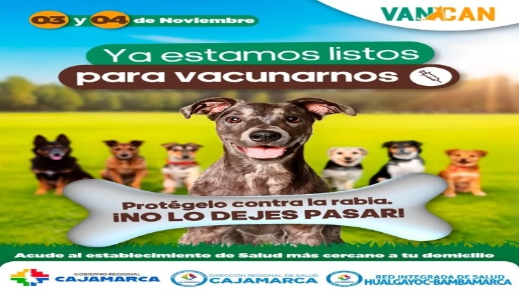 La Campaña Gratuita de Vacunación Antirrábica Canina “VanCan 2025” se desarrollará este lunes 03 𝘆 martes 04 𝗱𝗲 noviembren en toda la provincia de Hualgayoc. Acude al establecimiento de Salud más cercano a tu domicilio y lleva a tu mascota para su vacunación gratuita.